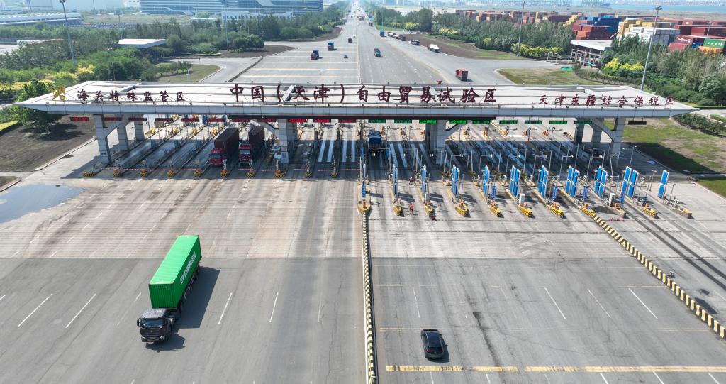 这是6月20日拍摄的天津自贸区天津港东疆片区入口处的中国(天津)自由贸易试验区海关特殊监管区入口(无人机照片)。【来源:新华网】